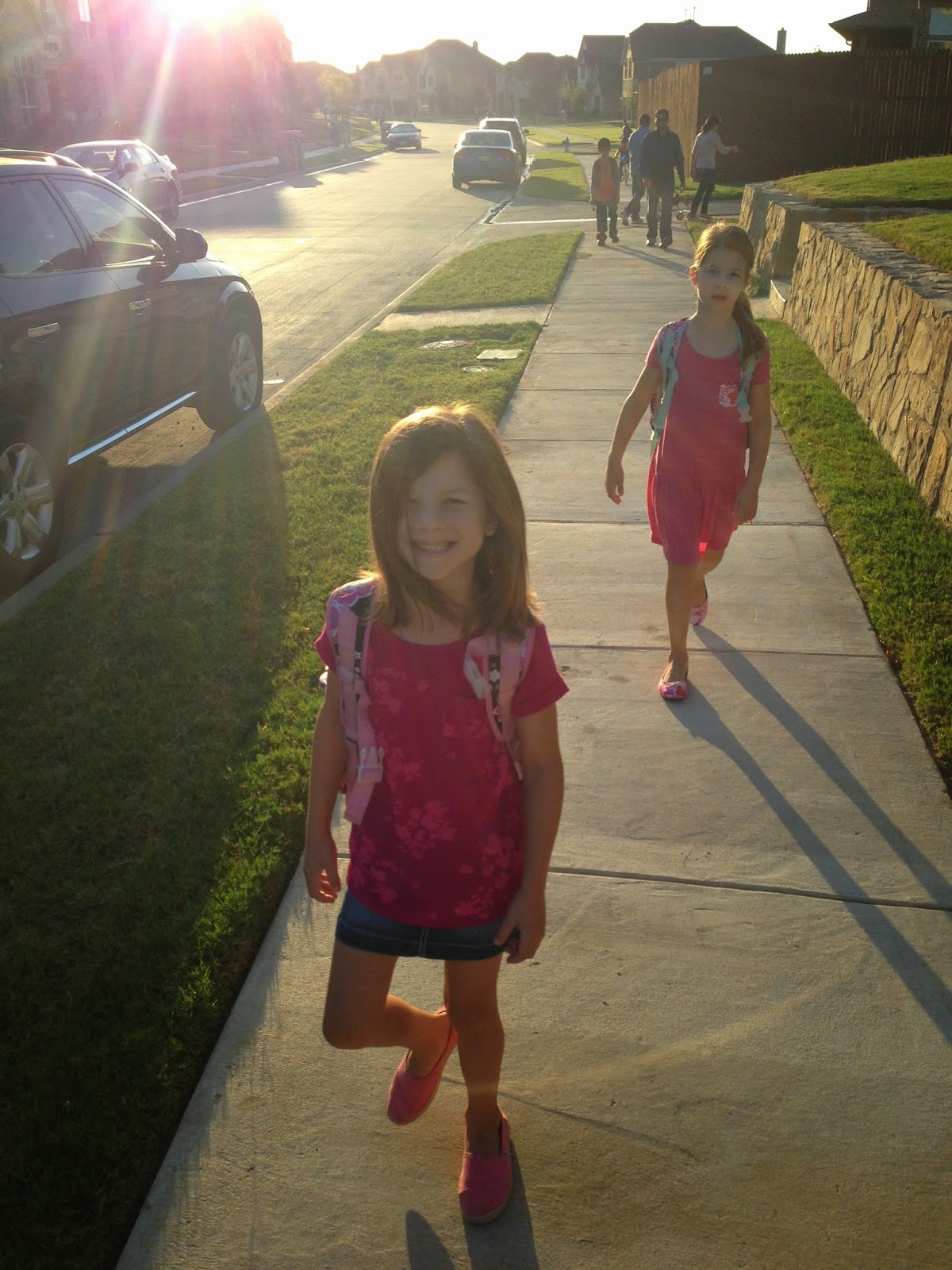 Ava and Macy are at a brand new school this year. Hosp Elementary. It is in our neighborhood and we get to walk to and from school which the girls LOVE! It is such a nice way to start the day. It gets them moving before school and Aubrey gets to go on a little morning stroll. It is great. After school isn't quite as fun because it is HOT but hopefully around mid October we will enjoy the after school stroll a little more. And when it gets to be 30 degrees in January, carpool here we come! : )